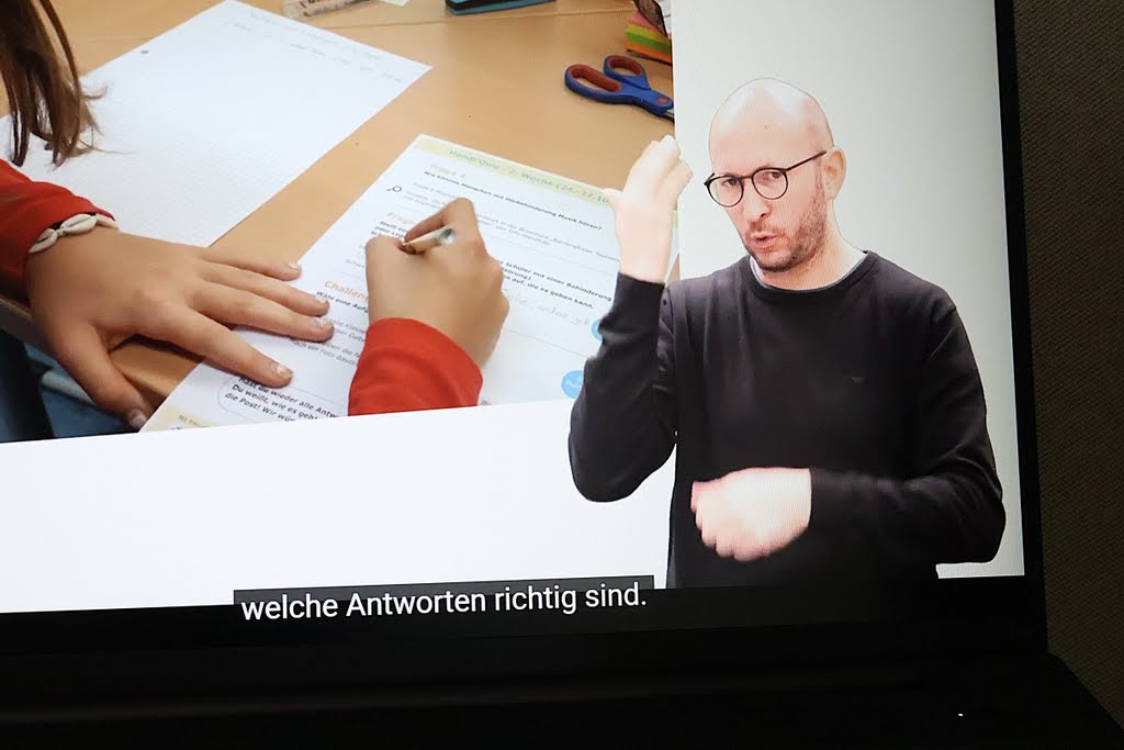 - Wichtige Inhalte nicht verdecken: Die Person, die gebärdet, sollte so positioniert sein, dass sie wichtige Informationen im Video nicht verdeckt. Gewöhnlich befindet sich die Person im Video unten rechts.
